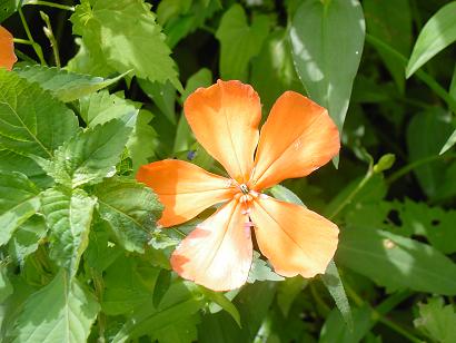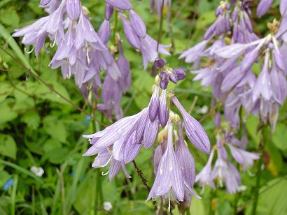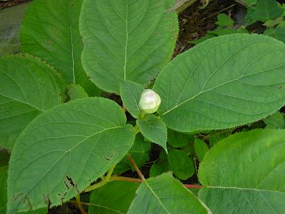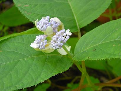 家(あずき亭)の裏庭の北側に西野川が流れています。九蔵峠の深い谷間を流れ、又一方標高3067mの御嶽山の複雑な地形、過去に3回の噴火によりその内部には1200もの滝があるそうです。この一つ「尾の島の滝」より流れ落ちる冷川(つめたがわ)がやがて柳又で西野川と合流しています。この合流点、以前は川幅ももう少し狭く、昭和50年代大水により家の北側にあった一枚の畑や桜の木が流され、又鳥小屋が朽ちて川側に落ちてしまいました。その後幾度かの護岸工事により川幅も広くなり、水害の心配も多分大丈夫だとは思います。柳又ポイントとして、旧石器時代の遺物が日本で始めて発見された場所だと言うことです。今は3万年前の矢じりなども発見されています。これは県宝山下家に展示されています。そんな訳であまり裏庭(川側)へは行かないようにしていましたが、草刈・花摘みのつもりで、庭をみると、うわさに聞いていたタマアジサイの開花時に偶然遭遇してしまいました。(私が所蔵の植物図鑑には載っていませんので判る方は教えてください)