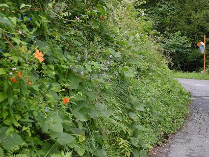 柳又の入り口付近の斜面は昔乍らの山野草が咲きます。6月初め、外来の草・ヒメジョオンや西洋ヨモギを引き抜き、下草を30cm程刈込みました。集落の入り口でもあるし、皆さんは畑仕事にお忙しいので、私はあずき亭への入り口でもあり、山野草が咲くのを楽しみにしての事です。作業中道を通る村人が、『田中さんお疲れさん』とか『ありがとう』とか声を掛けて下さいます。ちょっと恐縮していました。その後1週間程経ったある日。裾から1.5m余りを草刈機で綺麗に刈り込んだ跡が。あぁぁぁあぁ。どうしょうもありません。私の土地ではありませんし。それがこの1週間程前から、草刈りが功を奏したのかフシグロセンノウやソバナが群生しだしたのです。ツリフネソウや山萩も咲いています。皆さんも見に来て下さい。お隣のMおじさんどうもありがとう。素適な人なんです。