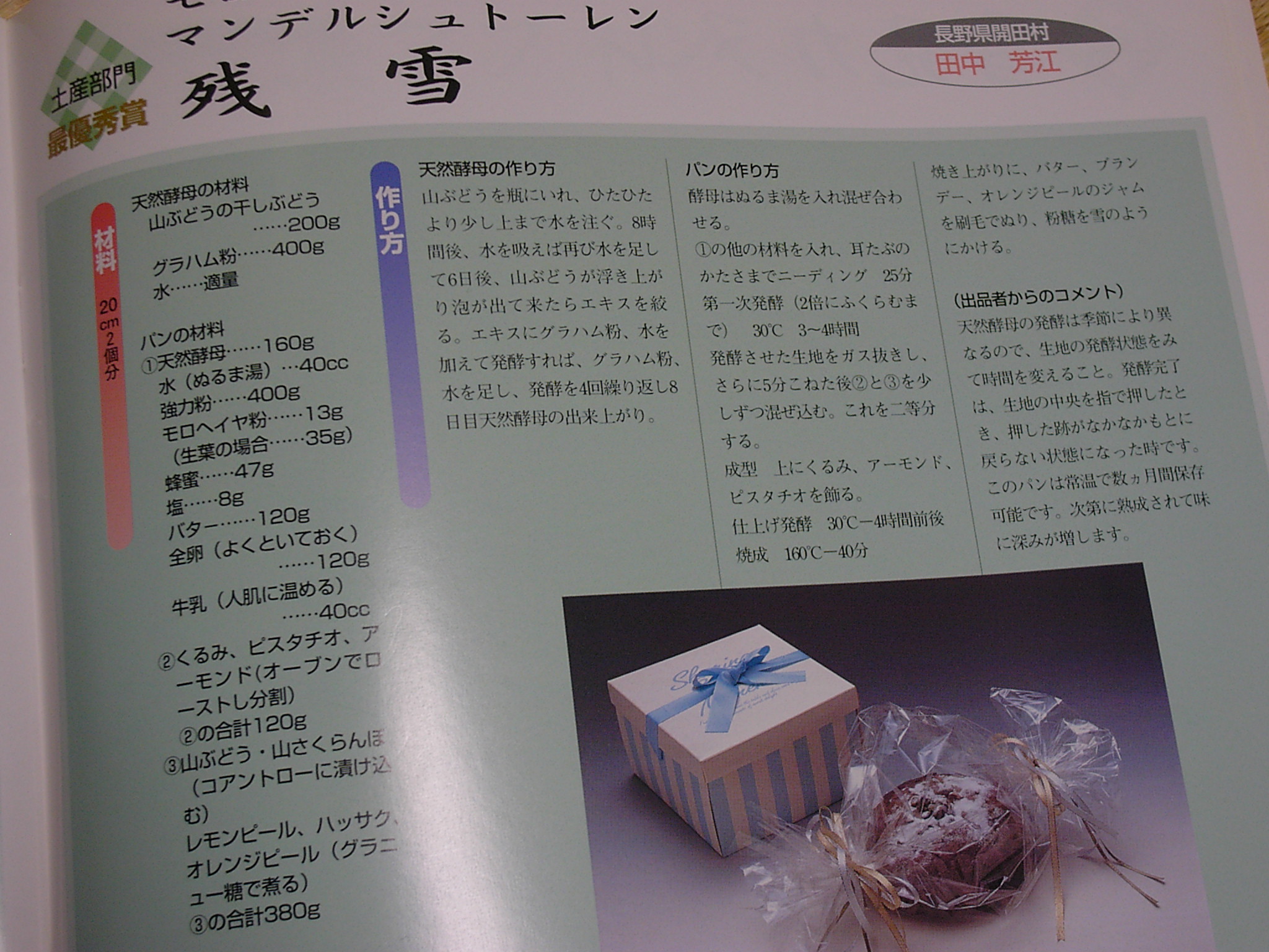 Sさんとお茶飲み話に『この間「ゆうがたゲット」という番組で乗鞍で山葡萄の天然酵母のパン焼いてるの見た?開田では無いのかなあ!』と言われ『見たよ!あの山ブドウの天然酵母発見したの、私なんだけど・・・・・』と言いますと。『ええぇええ』と。。。。。平成8年長野オリンピックの前年、長野の食を考えようと言う事で、料理コンテストがありました。私はその前年「そば料理コンテスト」で優秀賞を頂いたつながりで、応募資料が送られてきました今回は山ブドウで天然酵母づくりに挑戦、御岳山の恵みをイメージして、南部小麦・天然塩・開田の蜂蜜・生みたて開田産卵・家の畑で採れた無農薬モロヘイヤ・手づくりピール・木の実一杯詰め込んだパンを焼き名前は『モロヘイヤと山ぶどうのマンデルシュトーレン残雪』というなが〜い名前。応募914名第5次審査で36名が選ばれ長野のホテルに一泊旅行気分で参加しました。36人その中にはテレビで見覚えのある料理教室の美しい先生も居られ、商品化するための箱なども用意され、はたまた審査の前から長野駅前にて、販売している作品もありました。料理・軽食・土産部門審査委員長は元帝国ホテルの総料理長村上信夫さん、浜美枝さんに会いたかったのに当日は欠席、中華料理の先生・京都の懐石料理長、そば料理コンテストの時の料理学校の先生も居られ親切なアドバイスを頂きました。テレビカメラ、取材の方もガラス越しにぎっしりと。冊子の為の撮影も終わり私達も試食、どの作品も美味しい事、私のパンは今一と思いました。料理学校からスーツに着替え場所をホテルに移動、審査発表で土産部門最優秀賞で長い名前を間違えながら読まれた時の笑いこらえながら湧き上がる感動は今も忘れる事が出来ません。丁度更年期障害の真っ只中本当に自身無くしていた時でした。このパンが焼き上がり直ぐよりも2〜3日後から2週間後の方がピールや木の実がパン生地と上手く熟成され、美味しくなることに気づきました。又常温で秋から冬にかけてはビニール袋に入れて半年持つ事も発見。翌年梅雨の時期にカビてしまいました。まあ3ヶ月位は美味しいです。この天然酵母のつくり方新聞・テレビ雑誌に載り、東京のパンやさんも飛んで来られ、酵母菌少し差し上げました。特許取ったら・・・との話もありましたが、私も以前書かれた本を見て勉強させてもらって今があるので、多くの方が山葡萄の天然酵母使ってくださる事、今の時代に美味しい保存食があるのはいいと思います。災害に備え又暇になったら焼いてみようと思います。