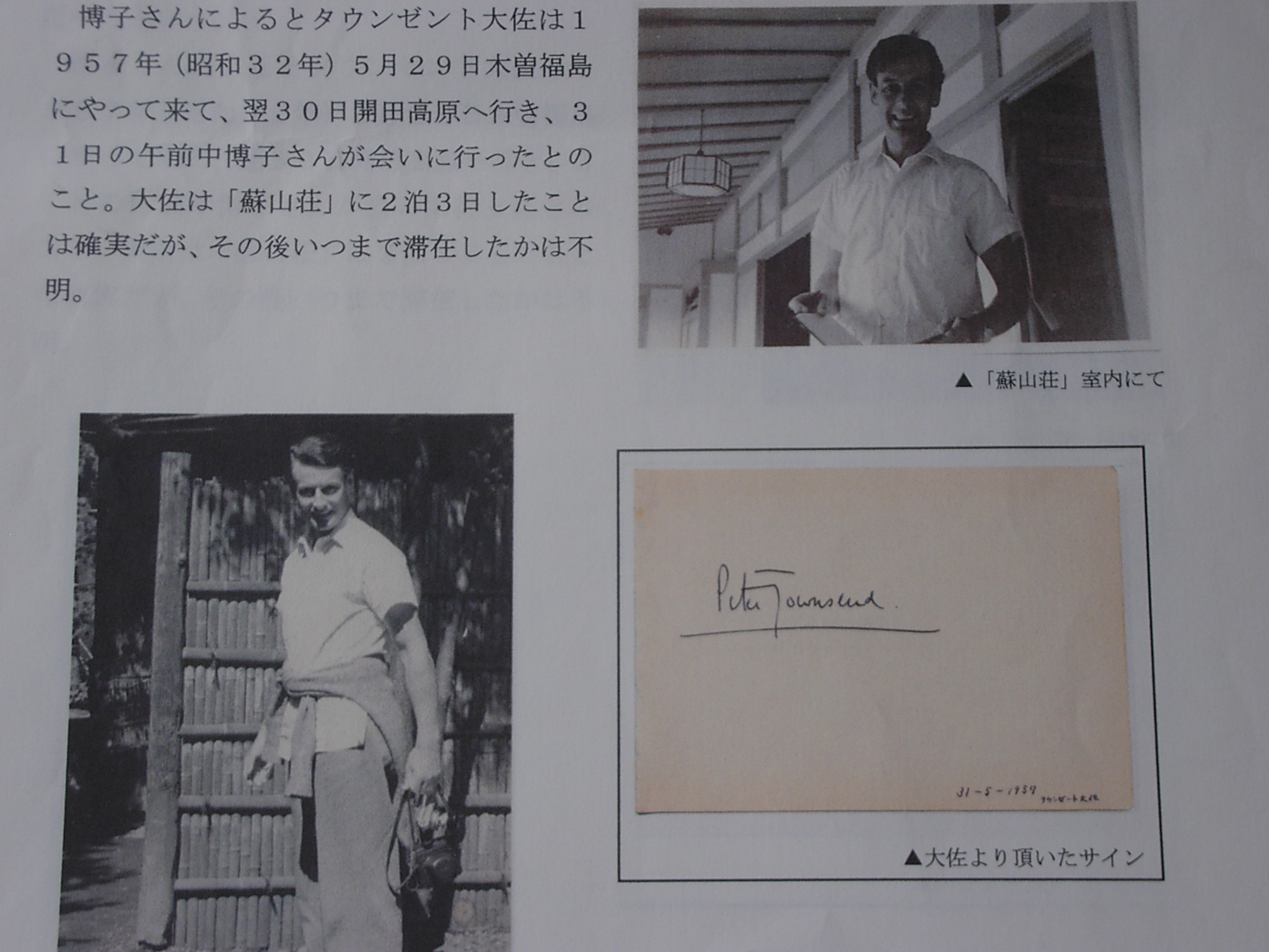 山村氏が日銀の副総裁だったことにより、この山村代官屋敷が以前日本銀行の山の家『蘇山荘』とされて居た時、英国マーガレット王女との悲恋をうたわれたピータータウンゼント大佐(元英空軍大佐)が世界旅行の途中に1957年(昭和32年)日本に立ち寄られ、5代目宝井馬琴さんの案内で5月29日木曽福島の『蘇山荘』に泊まられました。(この写真は代官屋敷お隣が実家の元外務省で通訳をされて居られた堀部博子さんが写された物)翌30日に開田高原にも来られ、鯉のぼりを『あれは何?』と聞かれたり、忘れな草を見られて、故郷を懐かしがられた・・・との話でした。マーガレット王女とのこの悲恋物語りが、後に『ローマの休日』の原作との話もあります。