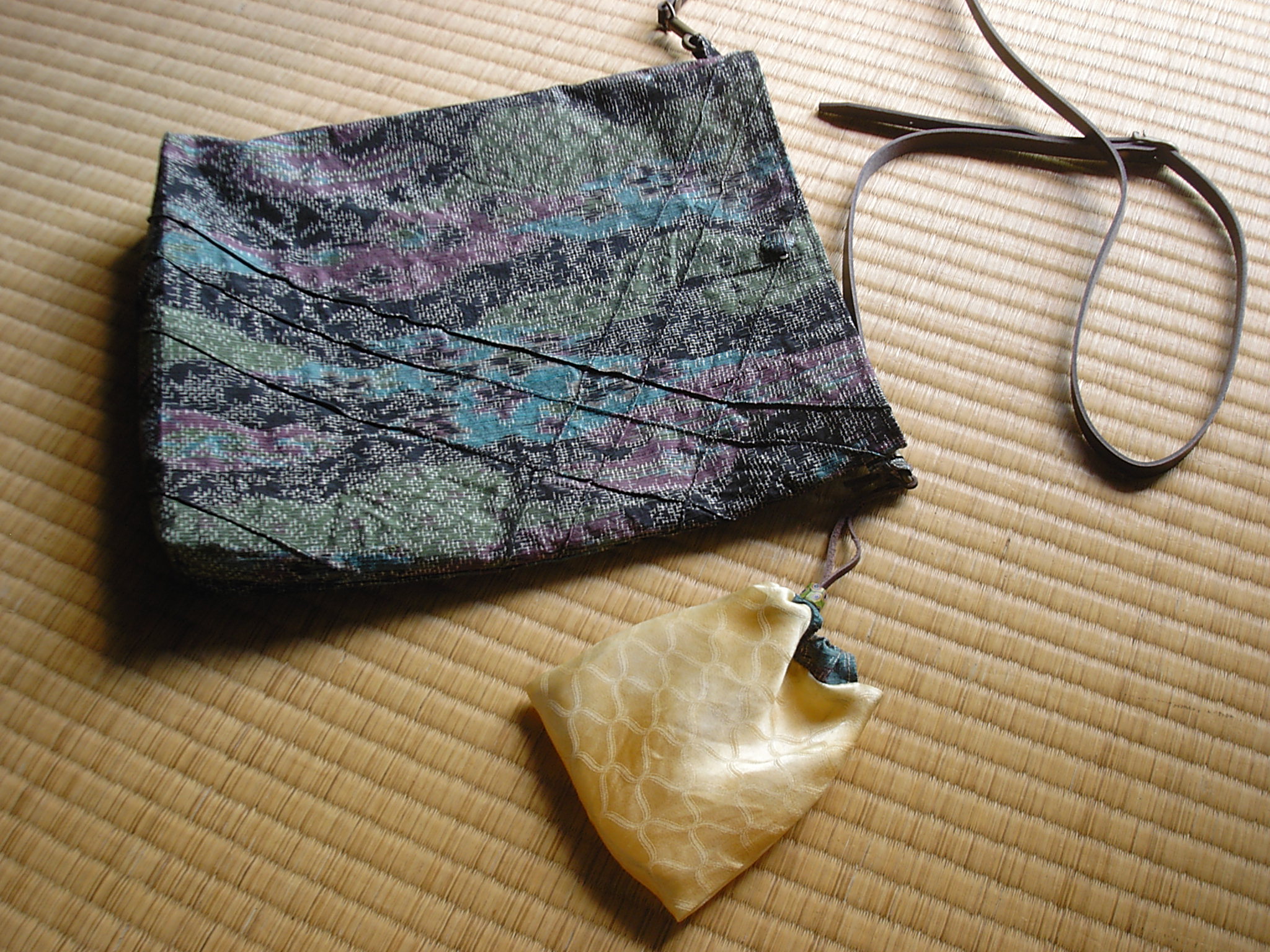 いつも前掛けを注文して下さる、近くのNさん通勤用のお弁当を入れるバックが欲しい・・・・。とご注文。私の紬の着物地残布でランダムにダーツを入れ、裏には羽織裏の綺麗な黄色の布を使いました。車の鍵を失くした話等聞いていたので、キーケースは皮紐とタイ産のトンボ玉を止め具にして、皮のショルダーベルトを付けました。見た目より、体に添って持ちやすい・・です・