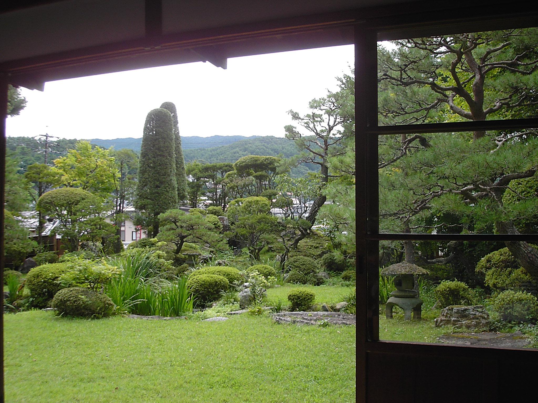 本町広小路プラザ前に集合した皆さん8名、先ずは山村代官屋敷、山村氏は木曽氏の旧臣、関が原の戦いでの功労により、木曽代官と福島関所の関守を兼ねた、今残る山村代官屋敷は私邸のほんの一部で、隣の小学校や福島会館一帯が屋敷跡・・・家紋の(一)○に一文字の説明から・・・道は一を生じ、一は二を生じ、三は万物を生ずる。入り口付近の灯篭には茶道具の彫りがあり、茶道はもとより、俳諧、和歌や漢文学の黄金時代を築いた等、築山泉水式の端正な庭園、当時としては珍しい板ガラスの窓。往時の食事が再現され、鯛にイセエビ、海の幸山の幸の豪華さ・・・・・雛人形や貝合わせ・・・・入り口の茶店で御茶までご馳走になり、移動・・、