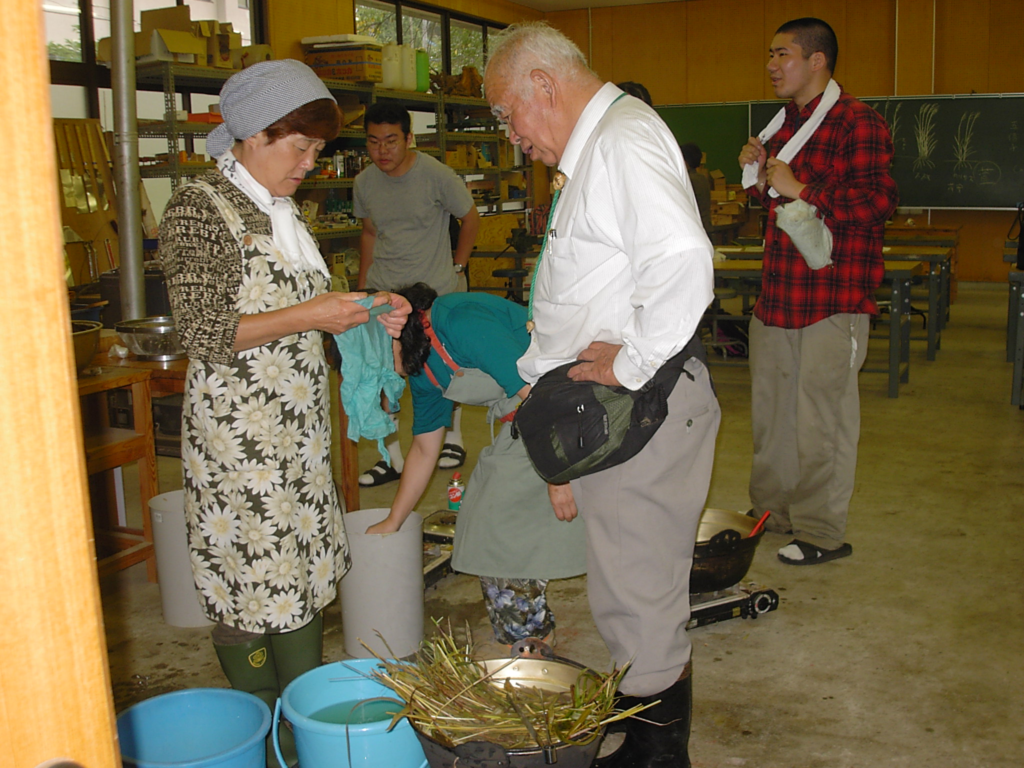 昨日は雨の中、林業大学校の一年生の生徒さん達に混じりと草木染の公開講座に参加してきました参加者は20名程。林大の近くを散歩しながら大木正夫先生の植物の説明をお聞きし、殆どの植物は染色に使えますが・・・それでも、どんな色に染まるのか、キブシ・クサキ・クズ・やヌルデ等染料に使う植物を採取・・・既に、家から持参して下さった、カヤや、キハダ又クリ・玉葱を炊き出して染めて行きました。