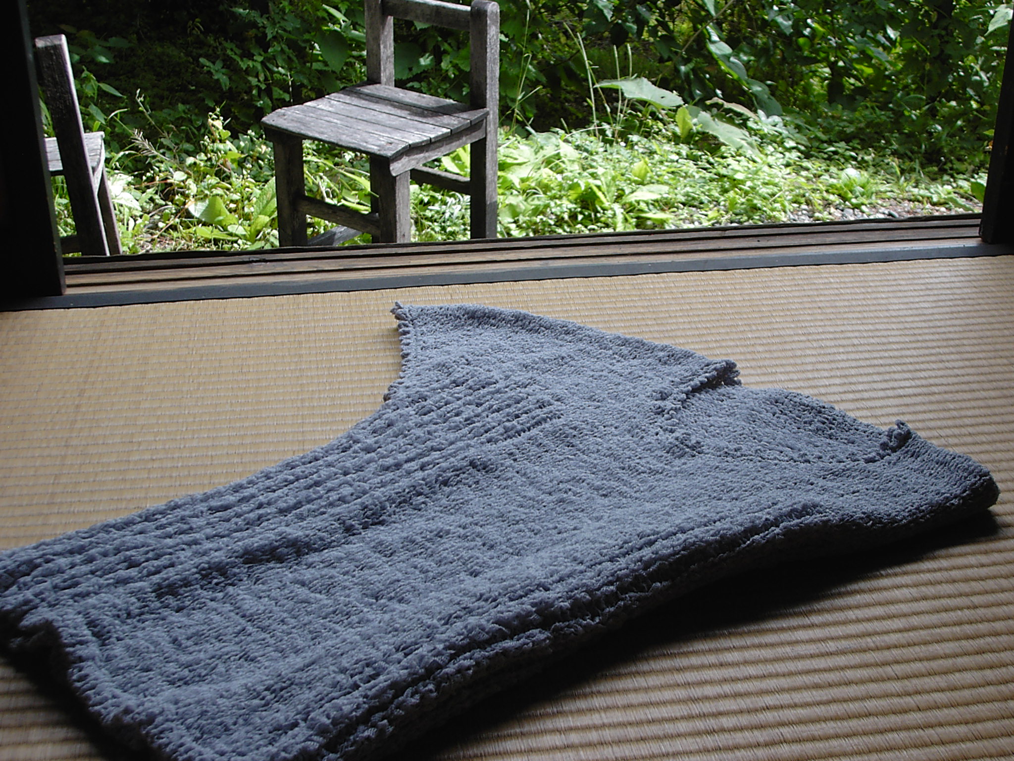 先日東京からのお客様。幼児の紺色のベスト、白い編み込みのセーラー衿の模様が気に入って下さり、購入したいとの事。でもこれは3歳の方用に作ったもの一目ゴム編みで伸びはしますが・・・『着てみます。これ戴きます・・・』と短くておへそが出ますが・・・・。とお母様も『今こんな短いのが流行っているんですよ』紺と紫の落ち着いた色のべレー帽を被って居られ、ご自分の作品で、帽子のデザイナーをなさっている方でした。