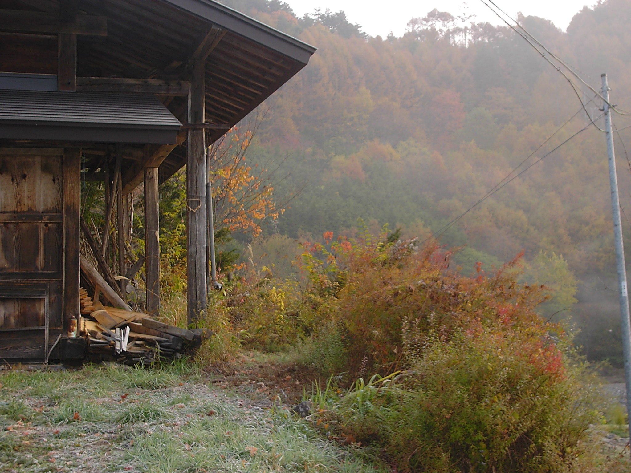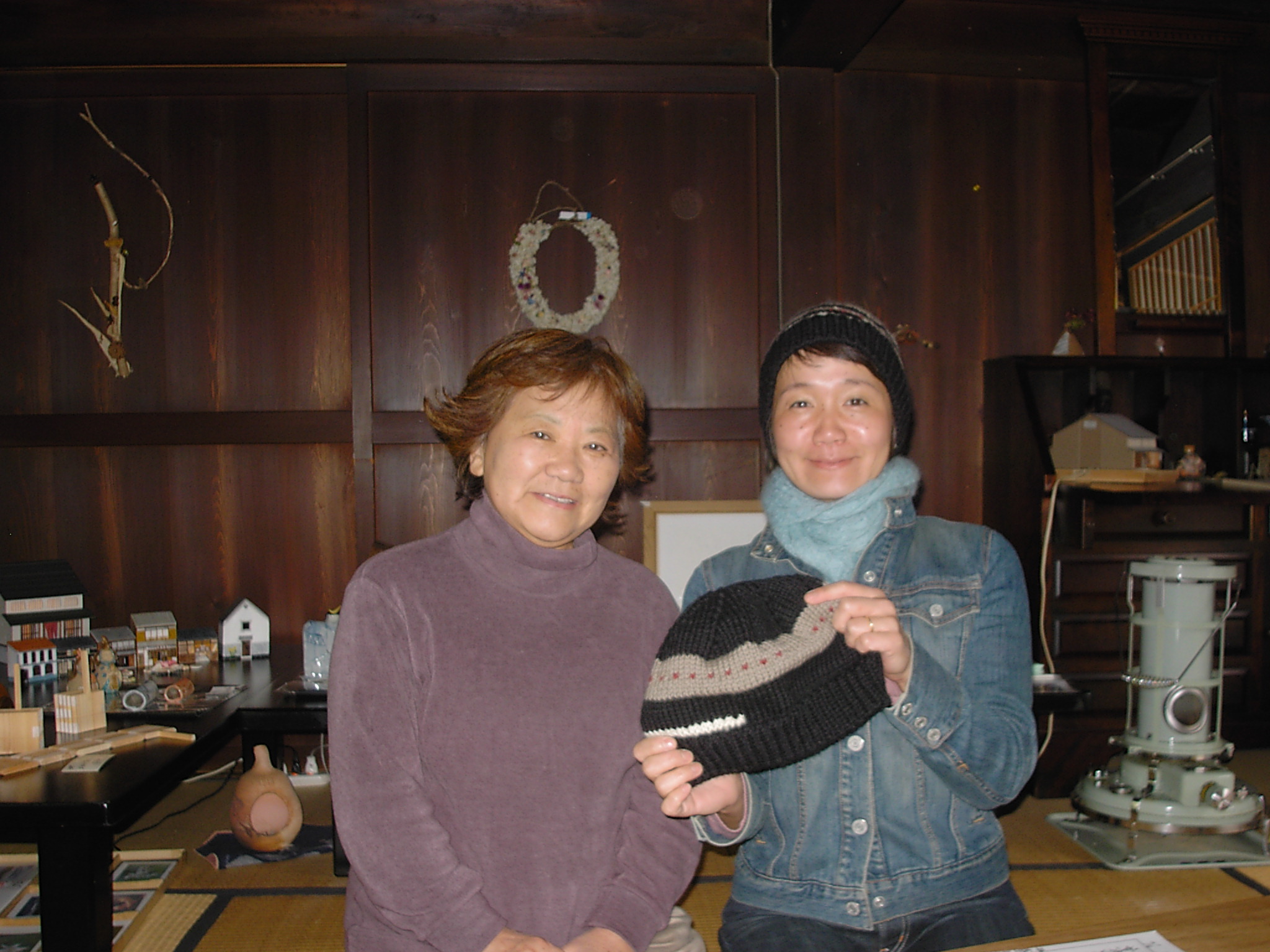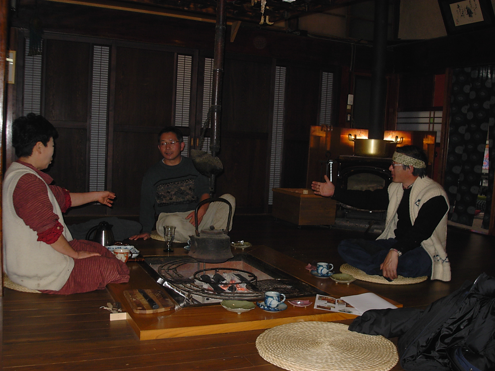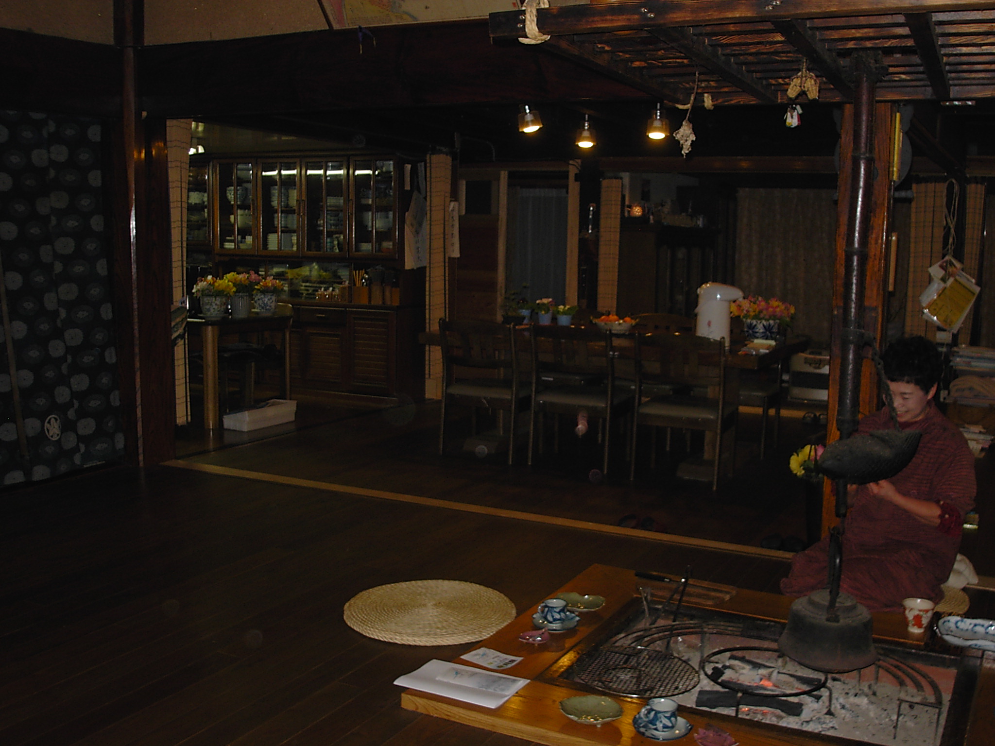 母屋は築100年位、玄関を入ると広い囲炉裏と薪ストーブが置かれた広〜い板の間、これは唐松材(信州国産材協組)建具が又素適板戸と千本格子の障子がデザイン化されています。この建物100坪あります。先日やっと屋根を直しました、面積が140坪ありました。と・・・・・いい雰囲気の女将さん、囲炉裏で草餅にコーヒー、フライパンで焼いたの!と栗が沢山入った蒸しパンどれもこれもこの雰囲気の中、満足々『何時か泊まりに来ます』と杜子春です。