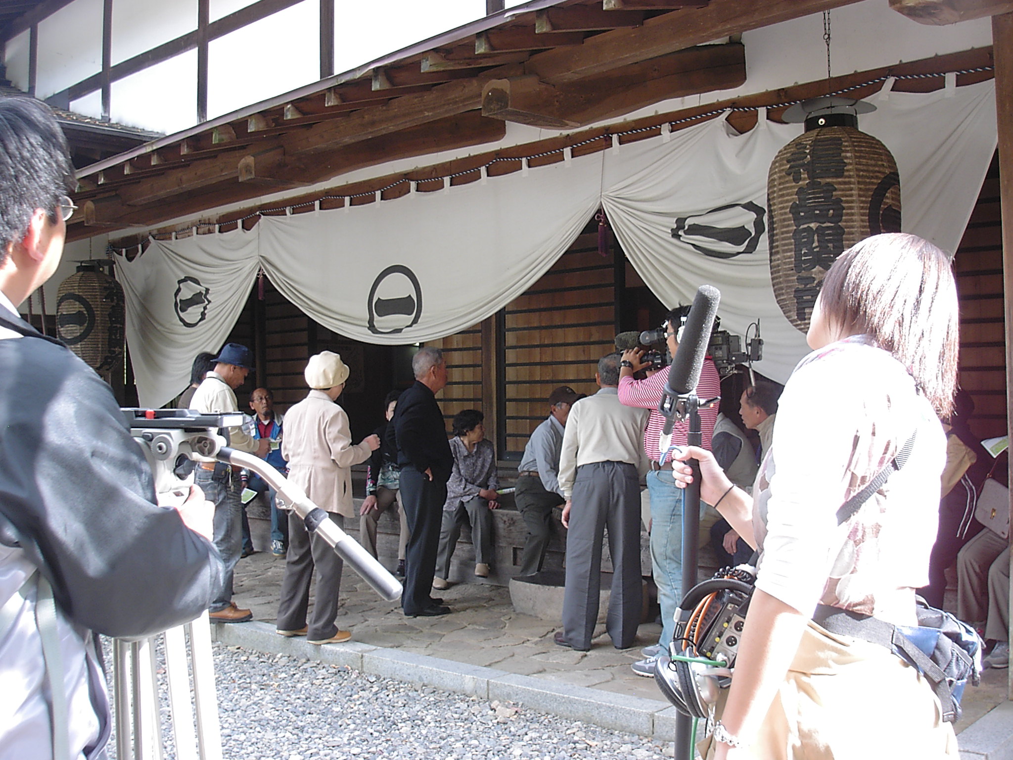福島会館では、京都東映撮影所衣装部から、代官江戸出府行列の衣装、腰元お女中、町娘の衣装に着替えた皆さんが次々と街中へ出掛けて行かれました。