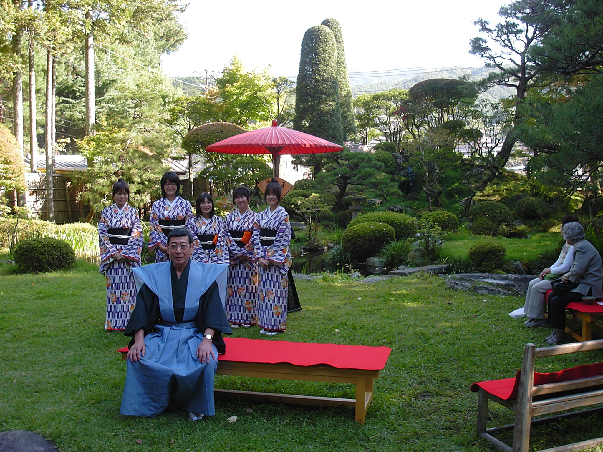 屋敷内の茶室では、お茶の先生と、木曽青峰高校の学生さんが腰元姿でお抹茶の接待をされていました。