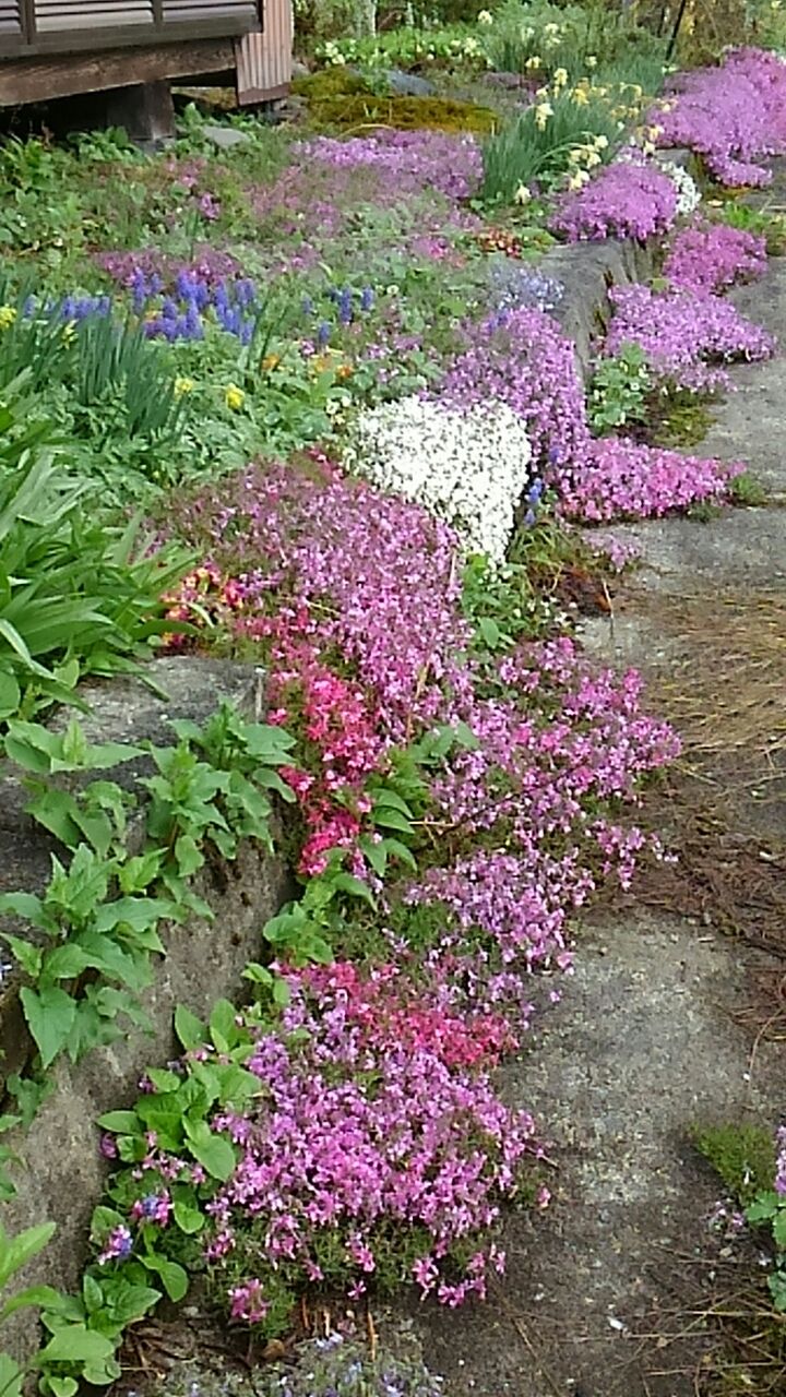 も。。。芝桜に紫の十二単。。。雨に打たれて頭をさげ。。。でももう少し咲きのこりそうです。