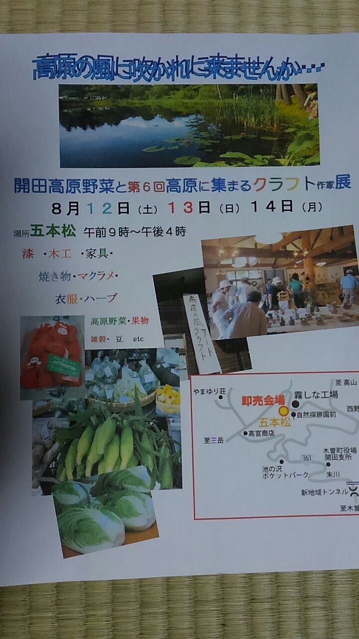 今朝の気温17度。今18度。曇り。。。雨もやっと上がりました。が、少し肌寒い。。です。 開田高原西野。。五本松で開催しておりました。高原野菜とクラフト展。。今回で第6回にもなりました。。。本当に多くの方達においで頂きました。。高原野菜も今成長中。。。昨日の雨で一段と大きく育ちました。そして、クラフト作家さん達ももう一年やってみようとの事になりました。。。美味しい野菜や果物と、気になるクラフトが、見付かります様に。。。皆様のお出掛けをお待ちしています。。