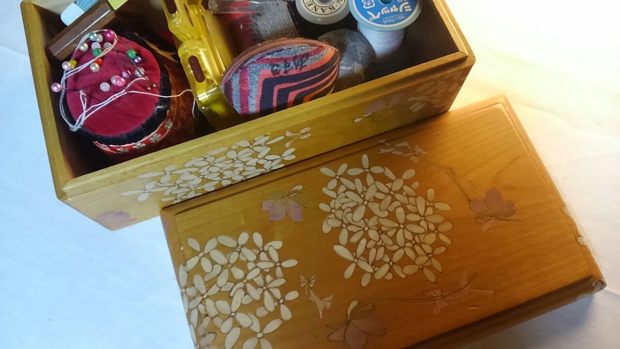 を取る程度。。今テレビで刺繍の話。。お祖母さんの裁縫箱。。が写りました。。最近は、ちょっとお洒落な空き缶を利用していますが、私にも、思い出の<頂き物。。和裁の教師の資格をとり。。勤務したのが、兵庫県の芦屋。。私も未だ20代。。生徒さんも未だ若い方達。。何年間か務めて。。退職時。。。特に慕ってくれた人からの頂き物。。。ズーと飾り物としていた。。けれど。。。ふと裁縫