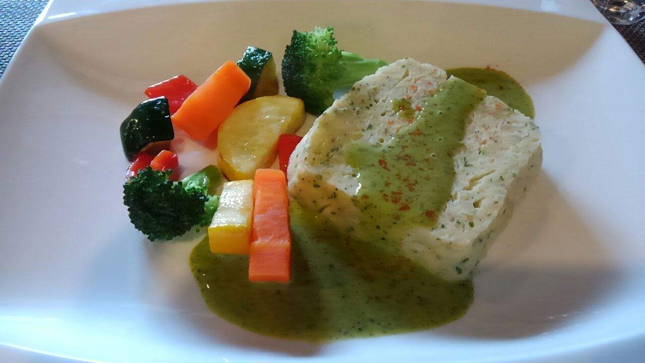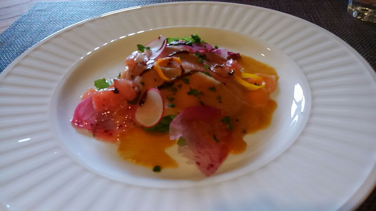 に。。テーブルのあちらこちらに来客が。。お昼のコース料理。。前菜は、サーモンのサラダ。。メインは肉と魚を選び。。友人は、肉料理。。私は魚料理