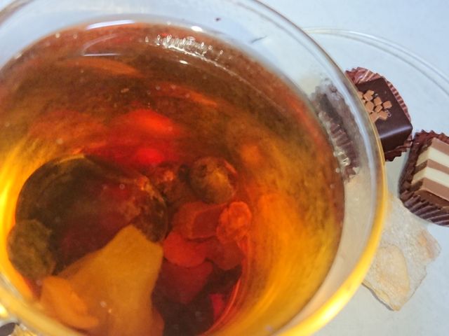 今回はドライフルーツ色々。。ブルーベリー・パイナップル🍍に巨峰、オレンジピールに熱々ハーブティーを注ぎました。ワイン色。甘酸っぱい香りに。。2杯目も。。ちょこっと甘いチョコレートを摘まんで。。。すっきり。。又編み物。。進めます。