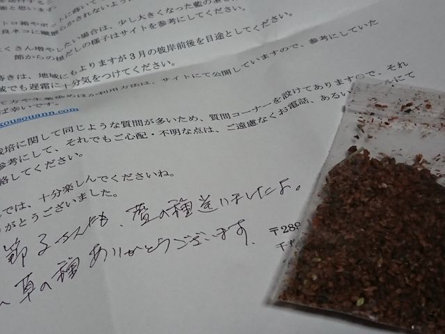 つを持って行きますが。。今日は小さなチョコ袋をリュックポケットにそっと入れました。。 昨日は申告の最後の収支のノート整理。。杜子春分とあずき亭も計算終わって。。気持ちもほっとして。。郵便ポストを見ると見慣れた文字。。は。中に藍染の種が入っています。。あれはもう3ヶ月も前。。種が欲しくてネットで調べるも、どこも貴重な藍の種は売り切れでした。。やっと探し当てた。。藍染の種を送って下さいの依頼文と返信用切手を張り。。。送りましたが何の音沙汰も無く。。もう諦め掛けていました。。この新年に嬉しい便り、春に植え付けが楽しみです。。新年に友人から頂いたアップルパイ。。今朝はちょっとお茶にいたします。