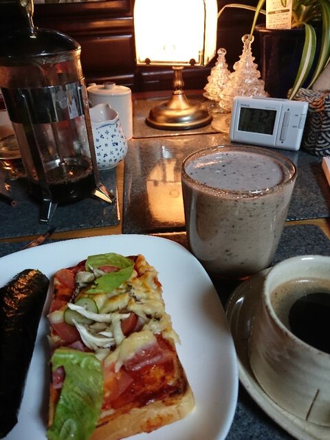 今朝は、久し振りにパン食にしたくて。。パンピザに野菜果物ジュースに珈琲と、矢張タラコおにぎりを。。