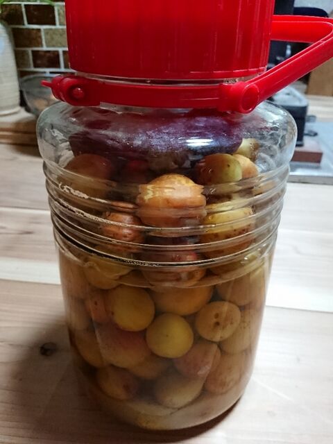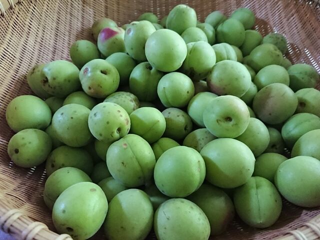 すると篭に重い程の熟し梅や、青梅が。夕食簡単に作り。「梅仕事」3kg.を「サシス漬け」に後の青梅は、なり口を取って。水に漬けています。