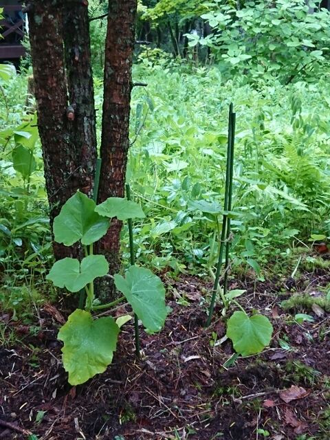 まだまだ雑草取りは、有りますが。気になっていた「カボチャの植えつけ」畑作りにはまだ至らず。玄関先の木の根もとを掘り起こし。。肥料を投入、先ずは2本のカボチャを植えました。。