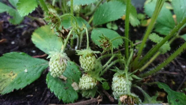 庭の苺が。。この寒さに。なかなか大きく成りません。。