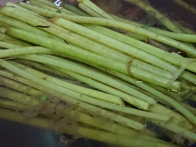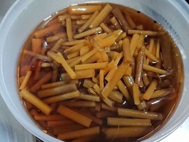 昨日も摘み取り、塩洗いに茹でて。太い物は、筋を取り。。今日は、佃煮コトコト煮る準備完了。