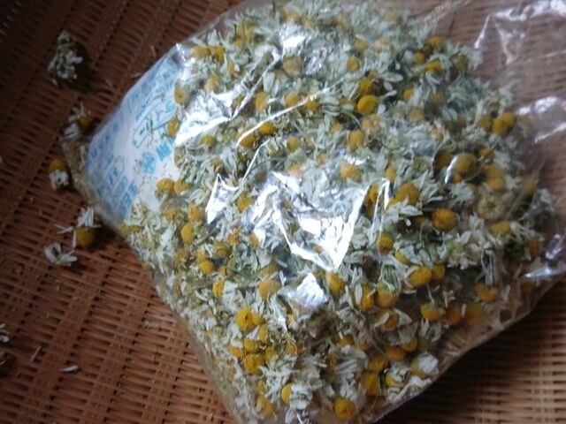 乾いた「カモミール」を袋に詰めて、「イタドリ」のお茶が。。良いとの事で乾燥に葉っぱをちぎり。。と
