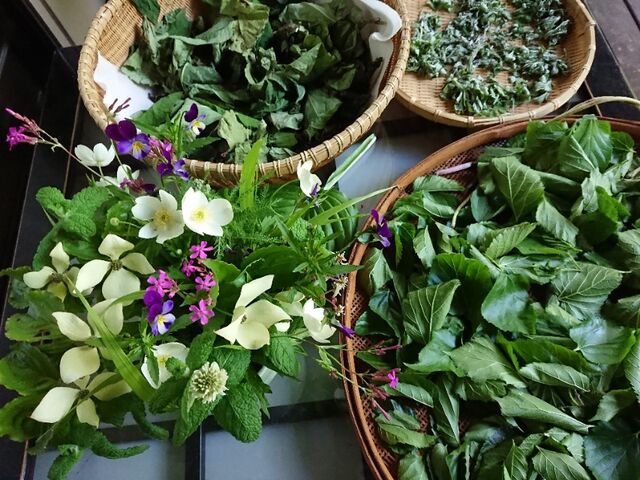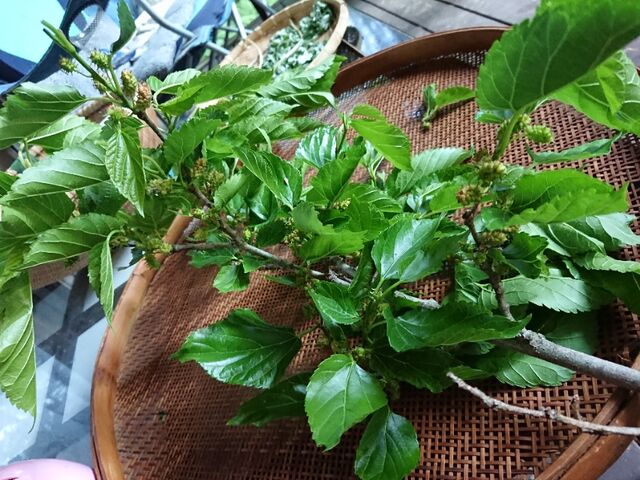 昨日は、柳又へ桑の葉っぱを乾燥させる為ですが。。柔らかい葉っぱに丸まった。虫が。。あちこちに。枝を5本程伐って持ち帰り。山荘のベランダでちぎって天火乾燥。