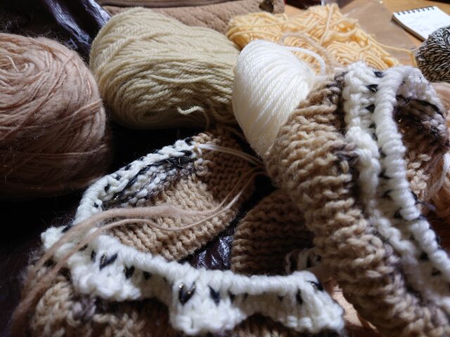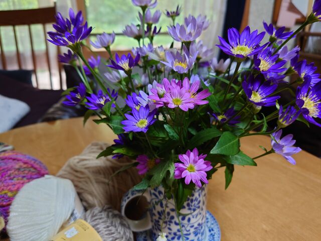 昨日は編み物。。前開きベストは前後ろの肩迄編み進みましたが、やっぱり気になる色合わせに10cm程づつ解いて、編み直しました。。