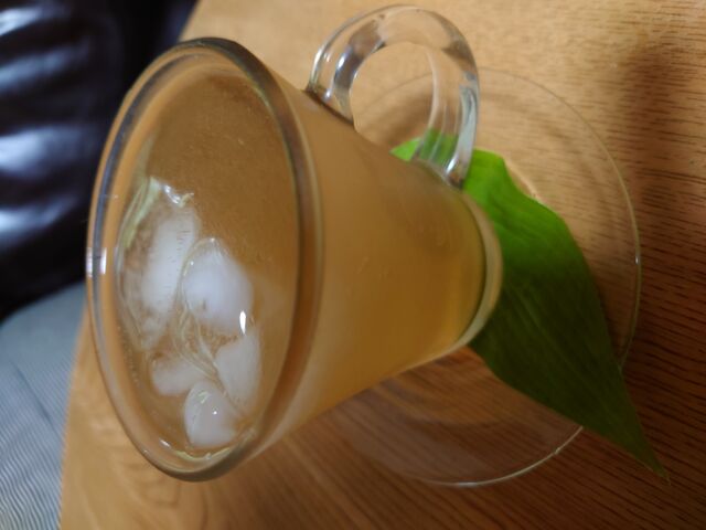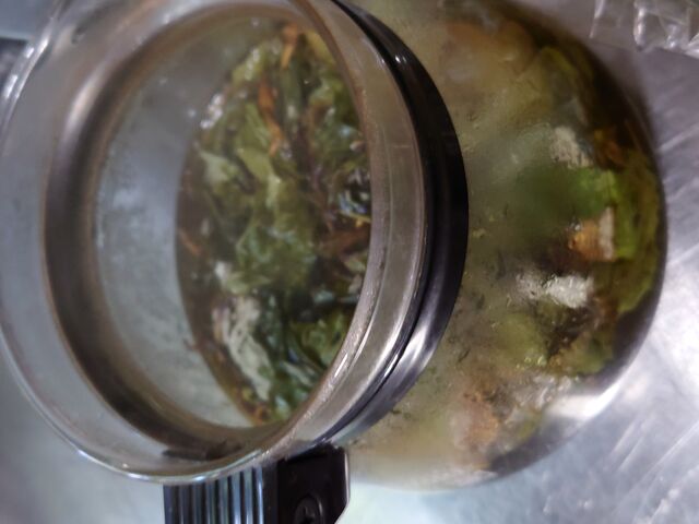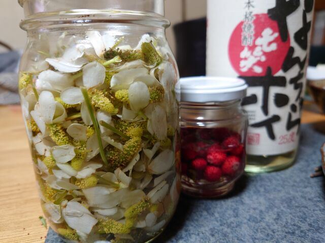 春から乾燥保存しています「イタドリ」に最近乾かした「ヨモギ」を取り出しフライパンで少し煙が出る程炒めてお茶にして見ました。。イタドリ茶を入れて少しづつ。何だか痛みが無く成る様な。