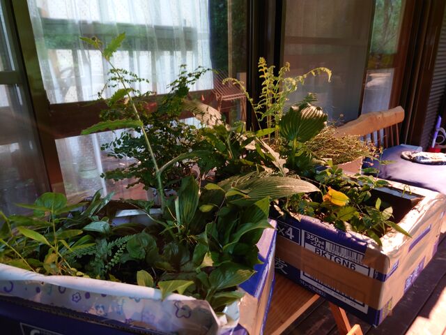 朝から杜子春の布団干し、カバー洗濯。ベランダに椅子セットの用意をして。。午後ニ時半。。もう少し庭の山野草を掘り起こし4箱を車に積込まれて。。結構汗かき疲れました。