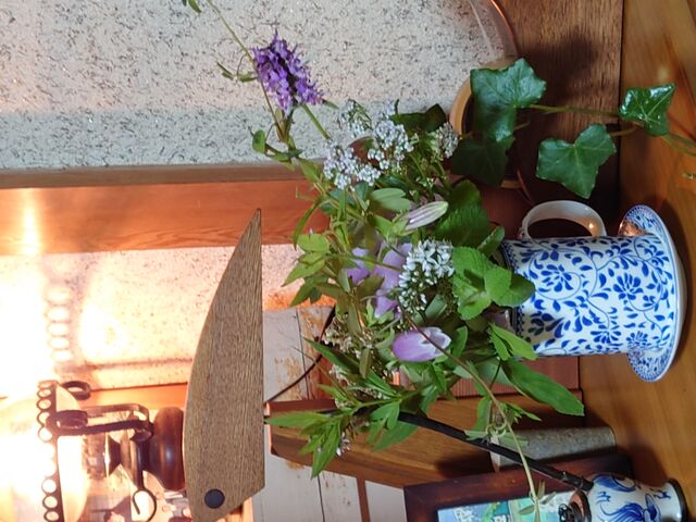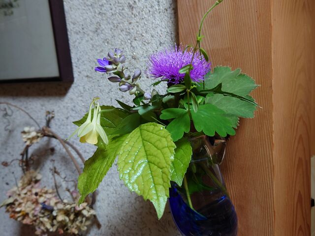 2、3輪を摘んで今回はノアザミにオダマキだけのちょっと寂しい一輪挿しでしたが。。