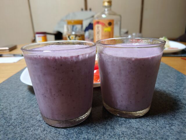 杜子春の弁当は詰め上がりました。そして。以前に作った「甘夏マーマレード」が冷蔵庫に入りっぱなしなのを使い。バナナと冷凍ブルーベリーでジュースにしました。
