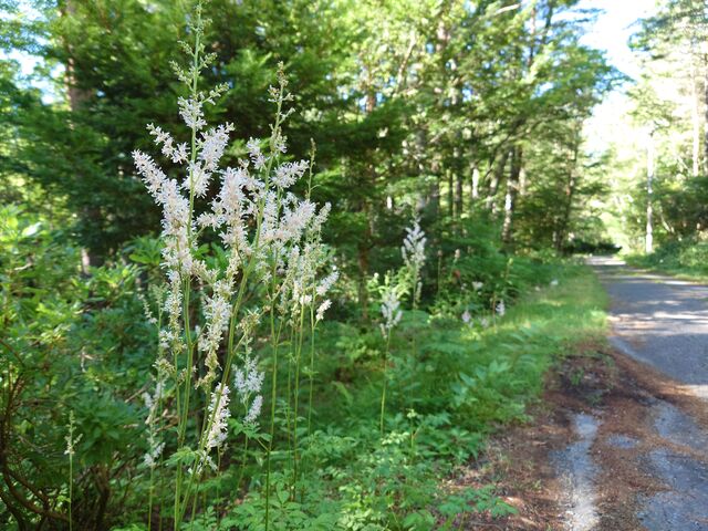 「タマアジサイ」に「アナベル」は根付きました。駐車場辺りから植えた近くを草抜き作業。。急坂に「ベニバナイチヤクソウ」を、残しながら熊笹を鋏て切りながら。帽子の上にネット付き帽子を被っていますが小さな小虫が顔の周りを。中にも入りそうなのか、細かい網目をくぐるのか。