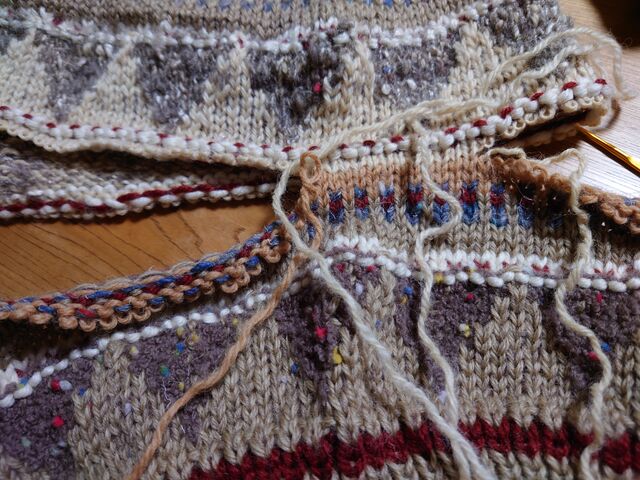 以前編んたベストの色合いがちょっと賑やか過ぎるかと気になって。昨日は下から25cm解きました。。そして下へと編み直しました。。
