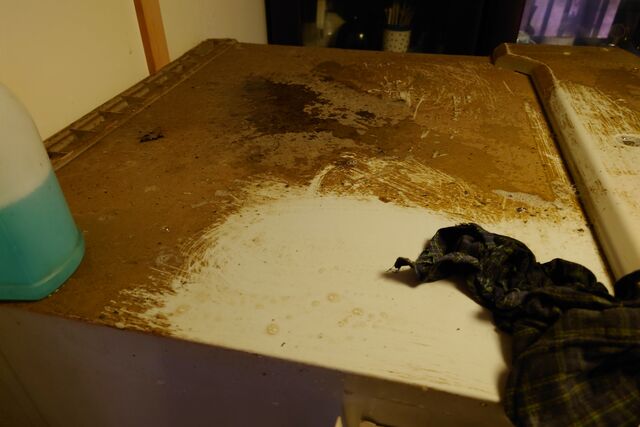 そして次はもう20年。。冷蔵庫上は柳又では一度も掃除出来ず。引っ越しの折りに拭こうとしましたが。頑固なこびり付きは断念して。。今回腰を入れて絶対にキレイに。。椅子に乗り、コールドテーブルの上に乗って。。冷蔵庫の高さは180cm程も有ります。先ずは金ダワシでゴシゴシ擦りネバネバの汚れを雑巾で拭き取り。。まだ残り汚れをスポンジで擦ってはタオルで拭き取り。。少しづつキレイに成って行きました。。窪みは歯ブラシで。。無理だと思われた。。茶色の汚れは、やがて白く成りました。。。