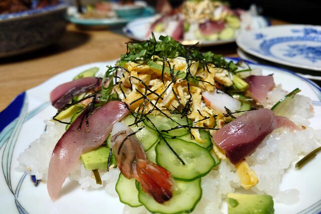 それならばと予定変更して夕食会に成りました。。急な事なので。スペアリブはまだ漬け込み不足かも知れないけれど。刺身はちらし寿司にと。出来る範囲で。ピザが大盛況(冷凍品)。