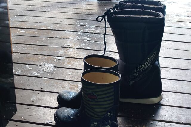 温めた長靴も履いて。。「ズボン長いカナ。。」に「大丈夫ダヨ。。」無事出掛けて行きました。