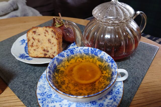 まだ少し温かさは残るケーキに果物下げでバスで友人宅へ。。びっくりさせようと。ピンポン…。一時間程を楽しい話題。。
