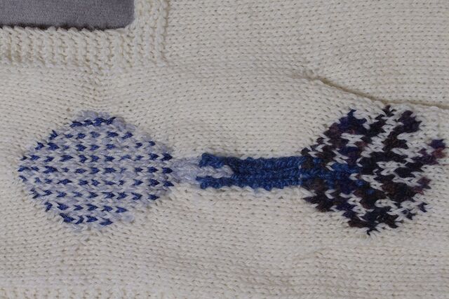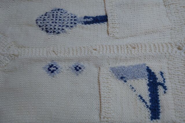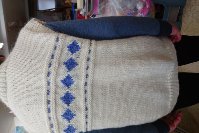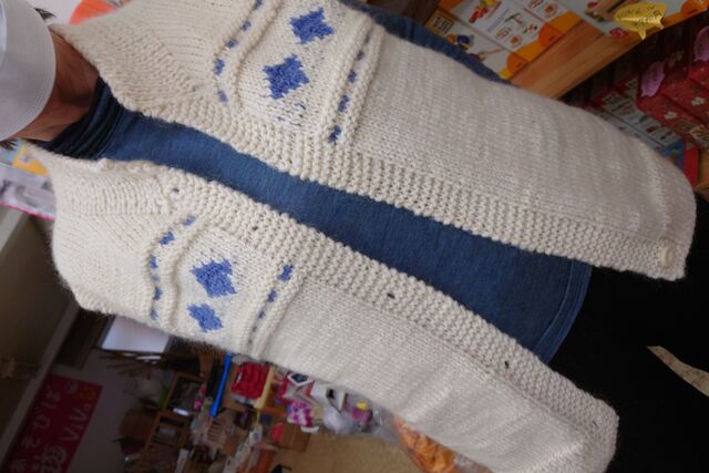 生成りで編み上がりましたベストはポケット位置に木の根っこも編み込み。。ポケット編んで。仕上げアイロン掛け。寸法計ってみると、大分大きくBは110cm以上。