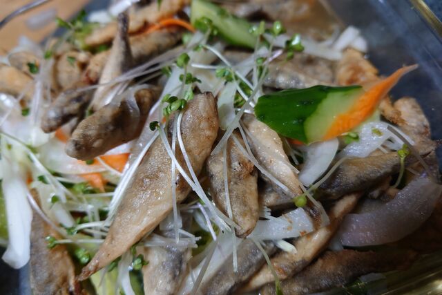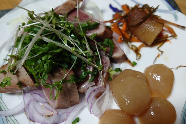 お腹も空いただろうにと夕食には冷凍ですが、鰹のたたきに漬け込みました松前漬け