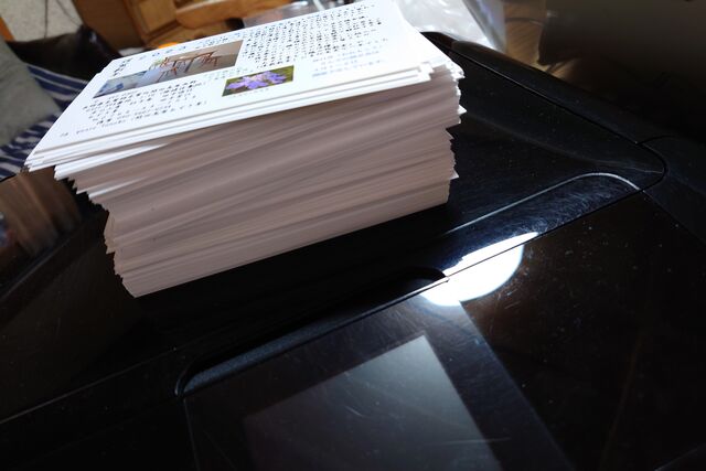 昨日は。。パソコン出して。。起動するも、偶にしか使わないパソコンはウイルスバスターの更新が必要だったり、新しく○○クリーナーと初めて聞く名。。色々触って居ると購入入り口に入って仕舞いそうです。。「筆めぐる」がやっと出て来て。。葉書の内容確かめて、少し変更。印刷開始30枚づつ挿入し、何とか300枚を印刷出来ました。。昨年、1昨年と投函枚数を減らし工夫致しましたが、結局は足りなくなり、友人知人に親戚。。親しいお客様。と今回も300枚に。。親しい方の中には、今回で失礼させて戴きます。。と、私達はいつまで続けられるのかと。。ふと、考えます。。が、年に一度、生活のお元気そうな様子を知る事は大切だとも思います。