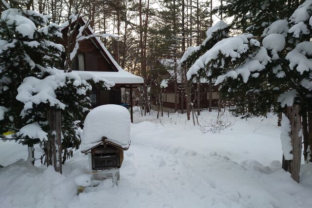郵便ポストの上やハーブの大きな植木鉢の上には60cm以上の雪。。3回目の雪掻き。ニュースで開田高原積雪42cmの報道通りです。。やっとの事、雪掻き終えて道路に辿り着きましたが、道路にも深い雪。とても手には負えず。。このままでは、車も杜子春の軽トラも入って来られません。管理セーターに連絡しました。。多分あちこちで除雪に忙しいと思いますが、杜子春帰宅迄にお願い致します。。