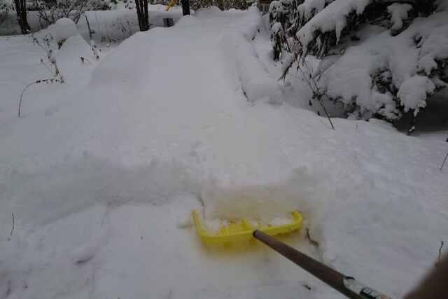 玄関先から真っ白に雪が積もっています。早速雪掻き。。重たい湿っぽい雪の重たい事。。倉庫から駐車場へ階段に。もう重たくて大分古い雪掻きスコップの端っこが、バリっと壊れました。玄関へのエントレンスの往復。。早出の杜子春は6時のチャイムに併せて出掛けて行きました。