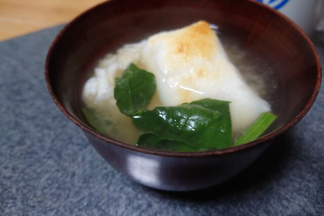 まだ真っ黒な外灯の灯りの下サラサラの雪が降ってベランダ迄真っ白。キラキラと輝いて見えます。今朝も早出なのでホットミルクに朝食はお餅を焼いて。雑煮。。