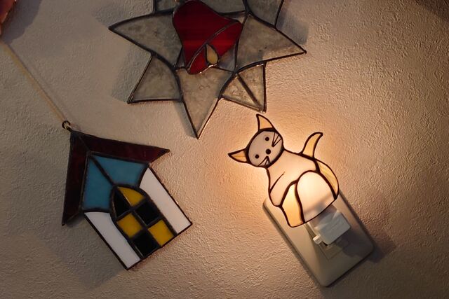 私は編み上がりのベストをお届けして。友人はステンドグラス作家さん。今回は「猫の足元灯」を注文しました。。が。色々な作品をプレゼントして下さり。。隣席に居られましたお二人さんが「写真撮って良いですか。。」ステンドグラス色々をそして「午後はお時間有りますか?」と尋ねられましたが。私は会議。
